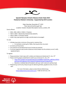 A province-wide invitational providing an opportunity to athletes to compete in the longer distances specifically. For more information, please contact hellainar@specialolympicsontario.com.